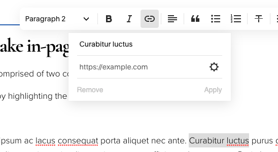 2 - Click the gear icon and edit the link. Type in the website URL “https://neurovascularcentre.ca/” and then add the URL slug for the page in question. Here we are using “example-inpage-links”