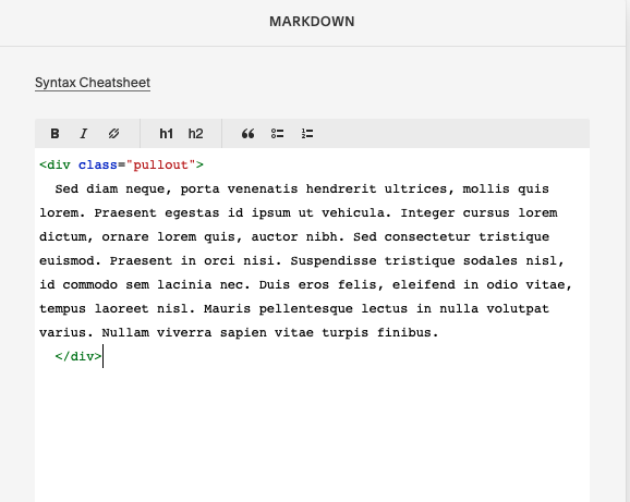2 - create a div within the markdown block, and attribute the “pullout” class to it. Type your content between the two tags. e.g.